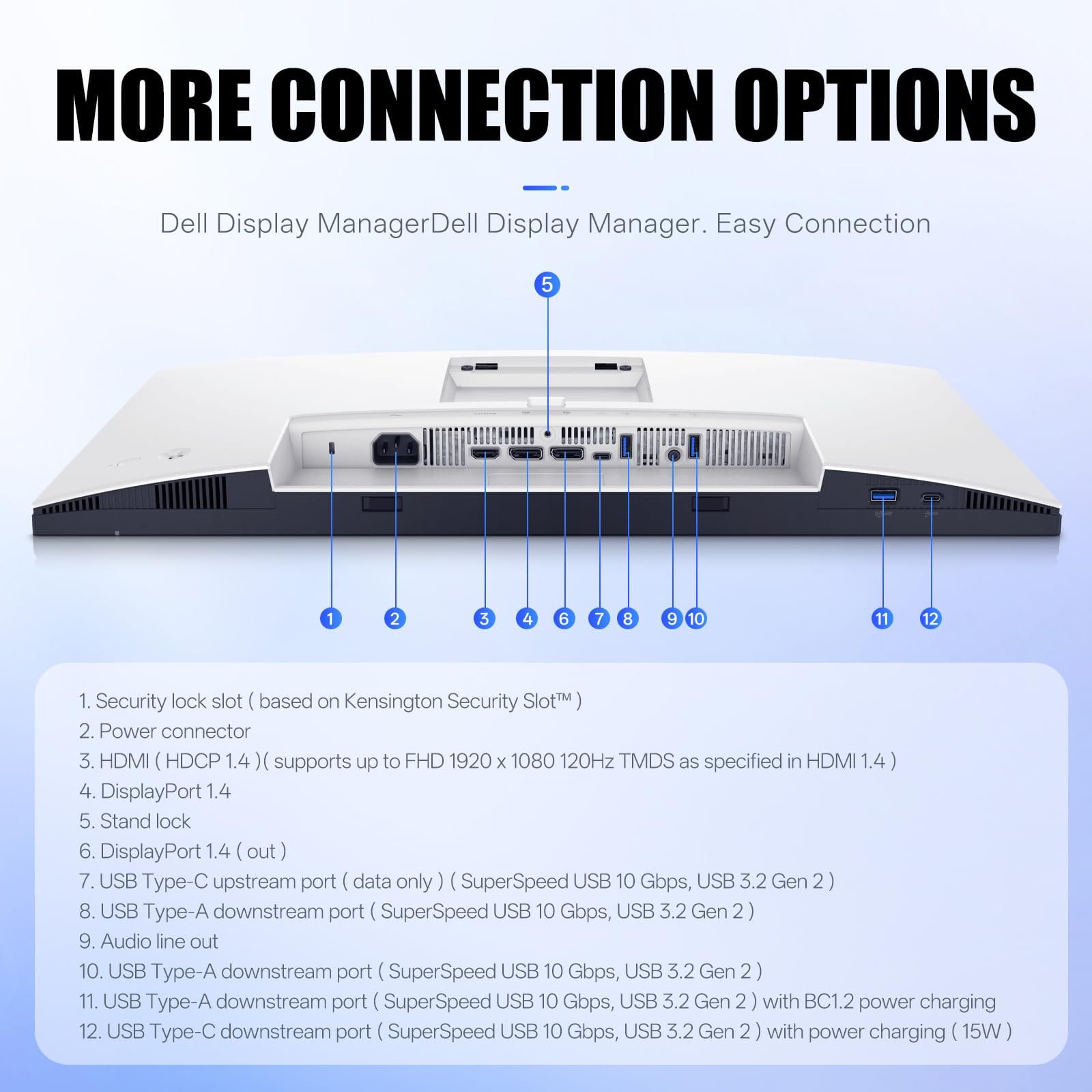 HDMI, DisplayPort In/Out (hỗ trợ chuỗi nhiều màn hình), USB-C (10 Gbps dữ liệu, một cổng USB-C có sạc ~15 W), nhiều cổng USB-A.